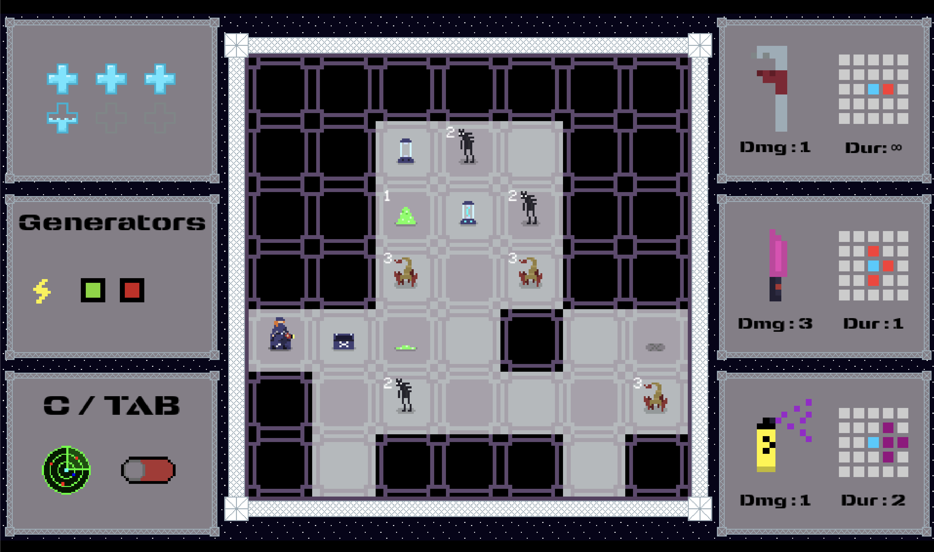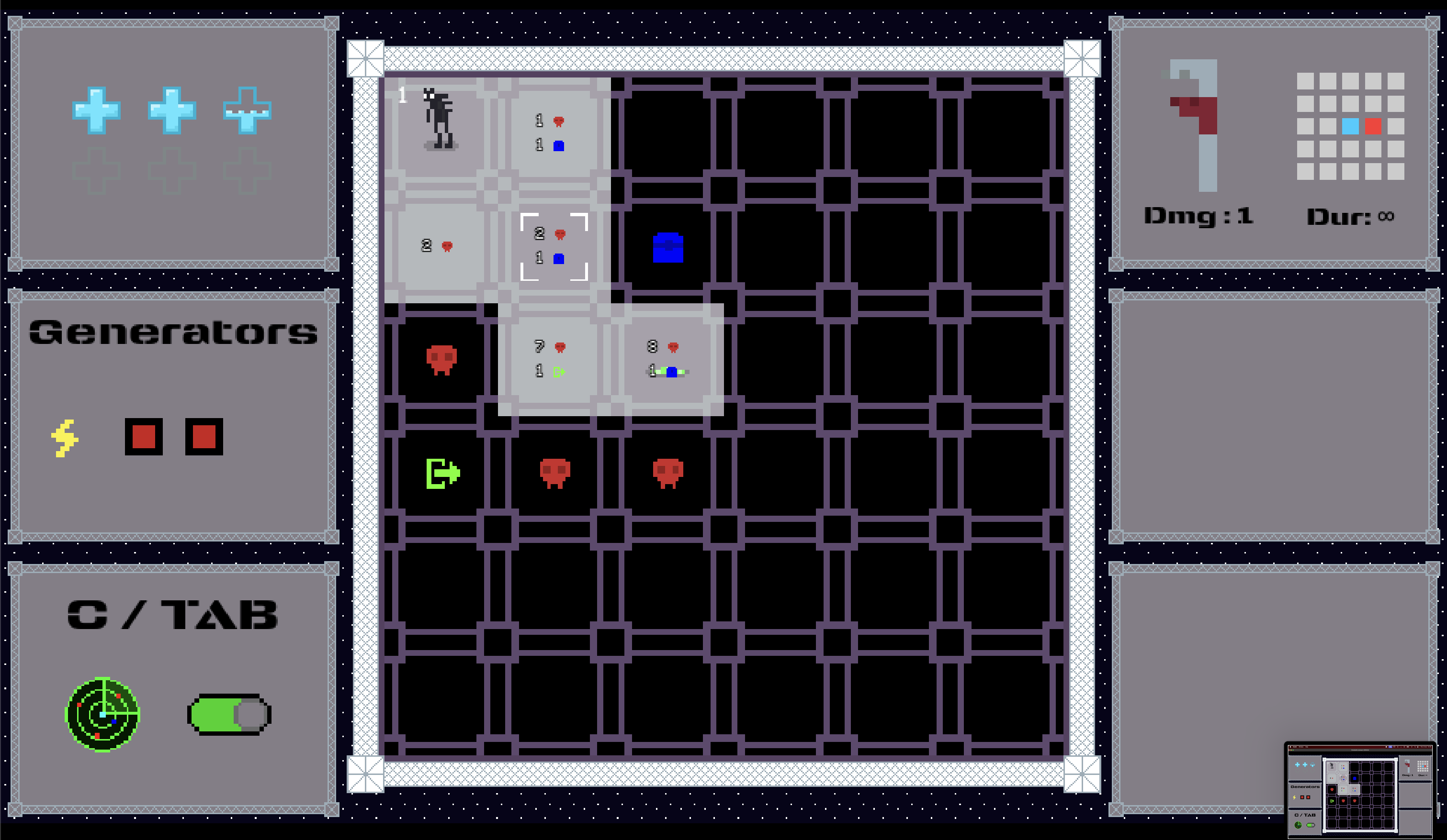 Click C or tab to enter inspect mode, where you can see combained hp of enemies on adjecant tiles, number of chests, generetors and exit. Additionally in this mode you can press enter or space when above unreaveled tile to mark it with your guess of what is under
